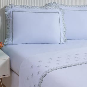 Conteúdo da embalagem:01 Lençol de cima com vira bordada 2,80m x 2,70m 01 Lençol de baixo com elástico em toda volta com 2,03m comp. X 1,93m larg. X 40cm altura 02 Fronhas bordadas 70cm x 50cm Composição: Tecido Percal 200 Fios 100% Algodão Marca: Não Informado