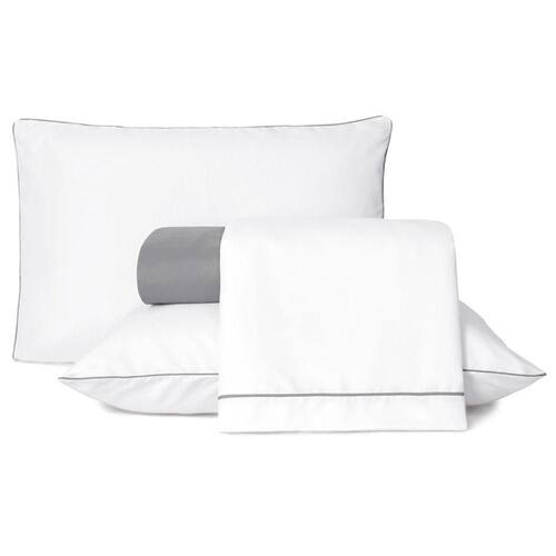 O kit conta com fronha e sobre lençol na cor branca. A fronha possui fechamento em envelope, o que facilita a retirada para lavagem. O jogo também acompanha um lençol com elástico nas 04 laterais.