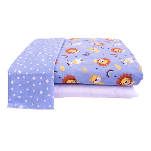 Características: - Contém 03 Peças - 01 Fronha: 28 cm x 40 cm - 01 Lençol com Elástico Liso: 70 cm x 1,30 m x 15 cm - 01 Lençol de Cima Estampado: 1,00 x 1,50 m - Tecido: 100% Algodão - Elástico nas Laterais - Ideal para Colchões de até 15 cm - Marca: Baby Joy