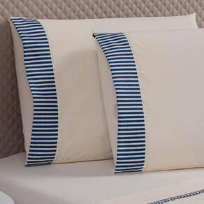 Com um design moderno de listras azuis e bordas elegantes, ele adiciona um charme atemporal à decoração do quarto, sendo perfeito para combinar com diferentes estilos. Resistente e durável, o tecido de algodão proporciona facilidade de manutenção e longa vida útil ao produto.