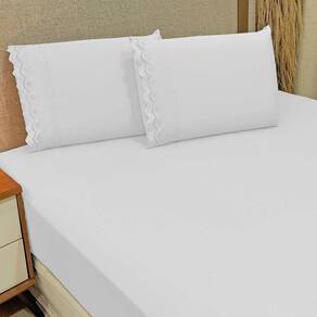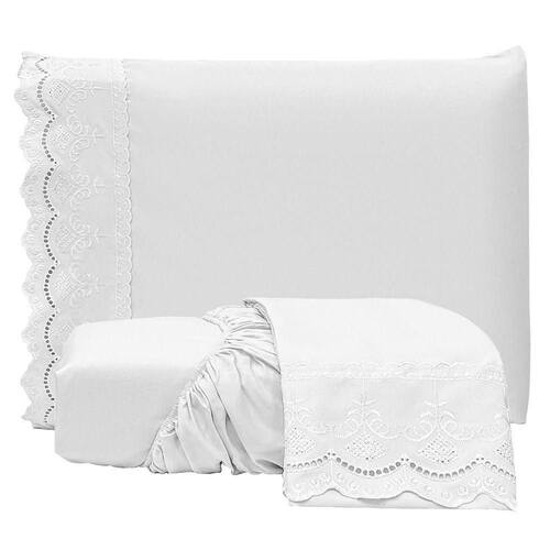 Jogo De Lençol Realce Casal 3 Peças Percal 300 Fios Bordado Inglês Macio - Branco - 100% Poliéster
