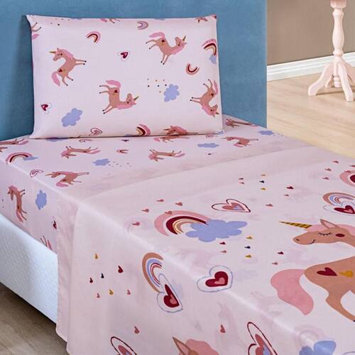 Especificações Produto: Jogo de lençol Tamanho: Solteiro Coleção: Fantasy Modelo: Unicórnio Composição: Tecido 100% poliéster Medidas do lençol de baixo: 90 cm x 1,90 m x 30 cm Medidas do lençol de cima: 2,50 x 1,50 m Medidas da fronha: 70 x 50 cm