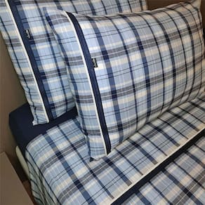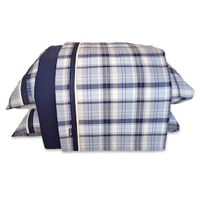 Jogo de lençol QUEEN com 4 peças: 02 fronhas, 01 lençol com elástico, 01 lençol de cima - Medidas do lençol de elástico: 1,60 x 2,00 x 0,40 m - Medidas do lençol de cima: 2,50 x 2,80 m - Medidas da fronha: 50 x 70 cm - Cor do lençol de cima: xadrez azul com branco - Cor do lençol de elástico: azul marinho - Tecido: Flanela Cataguase 100% algodão - Enchimento para os travesseiros não incluso - As cores podem sofrer alterações conforme a configuração de sua tela