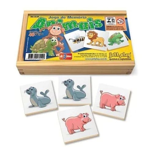 Jogo de memória animais Uso: a criança espalhará o jogo sobre a mesa com as figuras viradas para cima. Numa etapa inicial, procurará os pares classificando-os. Em etapa avançada, poderá voltar as figuras viradas para baixo que são pinçadas uma a uma formando os pares. Ótimo estímulo e entretenimento para trabalho em grupo ou individual. Desenvolve: atenção, concentração, memorização imediata, percepção dos detalhes, organização espacial. Composição: jogos de memória educativos, selecionados dentre os temas mais importantes na educação atual impressos em transfer brilhantes em fibro madeira. Acondicionados em caixa de madeira medindo 3,5x12x22cm. Contendo 40 peças em madeira. OCP0061 CE-BRI/NNAC-00128-6A