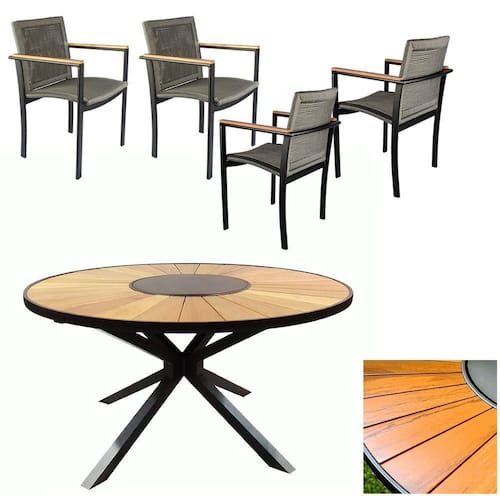 A mesa Zurick, com seu tampo de 1,30m em madeira e centro giratório, é a peça central que promove a interação e facilita o compartilhamento de petiscos e pratos. As 4 poltronas Amélia, com design elegante e estrutura em corda náutica e alumínio, oferecem o máximo de conforto e convidam a relaxar por horas a fio.