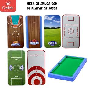 Jogo de Mesa de sinuca 7 em 1 com Pé CBS1085 - Castela DESCRIÇÃO DO PRODUTO Diversão garantida com a Mesa 7 em 1 com pés Um brinquedo completo que reúne sete jogos em um único produto: sinuca, boliche, hóquei, futebol, basquete, golfe e ice hockey. Acompanha todos os acessórios necessários para cada jogo e é ideal para estimular a coordenação motora, raciocínio e socialização das crianças. Produto versátil e prático, com estrutura estável e design colorido, perfeito para diferentes idades.