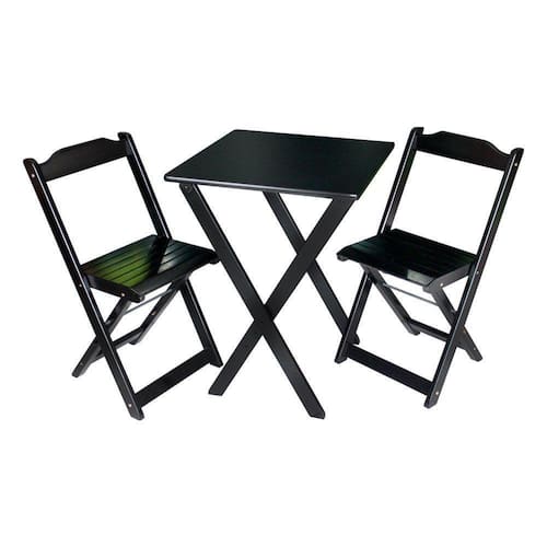 Jogo De Mesa Dobrável 60x60 Com 2 Cadeiras Decor Tarimatã - Pretoé ideal para bares, restaurantes, estabelecimentos, áreas de lazer e também para sua casa. Em madeira tornando-os resistentes e duráveis. Seu design permite que esse conjunto seja encaixado em qualquer ambiente, trazendo um toque a mais para seu estabelecimento. Além de sua durabilidade, o que lhe trará conforto para servir seus clientes. Por ser dobrável torna-se mais fácil guardar, manusear e limpar o produto.Atenção: EVITE USAR PRODUTOS ABRASIVOS E QUÍMICOS PARA LIMPEZA DO PRODUTO, aconselha-se o uso de pano umedecido para melhor conservação mantenha o produto fora de chuva e sol constantes.*imagens meramente ilustrativas*Medidas Mesa:Tampo 58x60 cm Altura 77cmDimensões Cadeira:Altura da cadeira aberta 78cm Altura da cadeira fechada 89cm Altura até o assento 46cm Largura 41,5cm Largura vão do assento 37,5cm Profundidade 40cm Profundidade do assento 32cmJogo de Mesa DobrÃvel 60x60 com 2 Cadeiras Decor Tarimatà - Preto