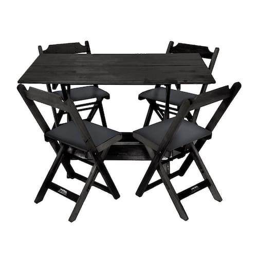 Jogo De Mesa Dobravel De Madeira 120x70 Com 4 Cadeiras Preto Estofado PretoTenha um pacote completo de praticidade e conforto com este conjunto, ideal para restaurantes, bares, estabelecimentos comerciais, áreas de lazer ou até mesmo para sua casa. Feito em madeira maciça, resistente e durável. Seu design permite que seja encaixado em vários ambientes trazendo um toque estético a mais ao mesmo. Além de estética, este conjunto de mesas e cadeiras também garante praticidade de locomoção dos produtos, longa durabilidade e estofamento confortável.ATENçãO: EVITE USAR PRODUTOS ABRASIVOS E QUíMICOS PARA LIMPEZA DO PRODUTO, aconselha-se o uso de pano umedecido para melhor conservação; mantenha o produto fora de chuva e sol constantes.Matéria prima:Madeira Maciça, de alta densidade e resistente.Sua variação de tonalidades é uma característica típica desta madeira, podendo apresentar diversos tons num mesmo produto em harmonia com o brilho do verniz.Modelo: Dobrável com Cadeiras Dobráveis estofadasCor: PretoCor do Assento: PretoDimensões (Mesa): Altura 90cm / Largura 120cm / Profundidade 70cm Dimensões (Cadeiras): Altura 88cm / Largura 43cm / Profundidade 33cmJogo de Mesa Dobravel de Madeira 120x70 com 4 Cadeiras Preto Estofado Preto