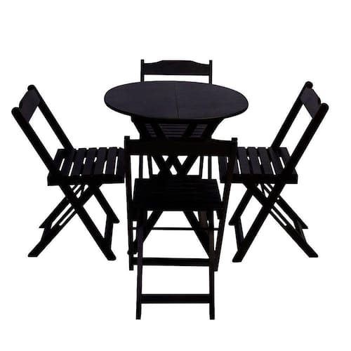Jogo De Mesa Dobravel De Madeira 90cm Redondo Com 4 Cadeiras Pretoé ideal para bares, restaurantes, estabelecimentos, áreas de lazer e também para sua casa. Feito em madeira maciça, tornando resistentes e duráveis. Seu design permite que seja encaixado em qualquer ambiente, trazendo um toque a mais para seu estabelecimento. Além de sua durabilidade, o que lhe trará conforto para servir seus clientes. Por ser dobrável torna-se mais fácil guardar, manusear e limpar o produto.Atenção: EVITE USAR PRODUTOS ABRASIVOS E QUíMICOS PARA LIMPEZA DO PRODUTO, aconselha-se o uso de pano umedecido para melhor conservação; mantenha o produto fora de chuva e sol constantes.Matéria prima:Madeira Maciça, de alta densidade e resistente.Poderá ocorrer variação de tonalidades que é uma característica típica, apresentando diversos tons num mesmo produto em harmonia com o brilho do verniz.Modelo: Conjunto de Mesa e Cadeira DobráveisMESA Cor: Preto Modelo: Dobrável Dimensões: Altura 90cm | Largura - Profundidade 90cm (diâmetro)CADEIRA Cor: Preto Modelo: Dobrável Dimensões: Altura 88cm | Largura 43cm | Profundidade 33cmJogo de Mesa Dobravel de Madeira 90cm Redondo com 4 Cadeiras Preto