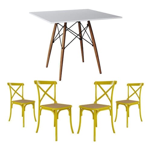 Jogo De Mesa Eiffel Quadrado Tampo De Madeira 90cm Branco Com 4 Cadeiras Katrina Amarela Assento Beg