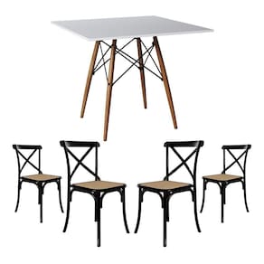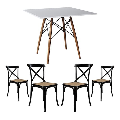 Jogo De Mesa Eiffel Quadrado Tampo De Madeira 90cm Branco Com 4 Cadeiras Katrina Preto Assento Bege