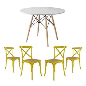 Jogo De Mesa Eiffel Redondo Tampo De Madeira 110cm Branco Com 4 Cadeiras Katrina Amarela Assento Beg