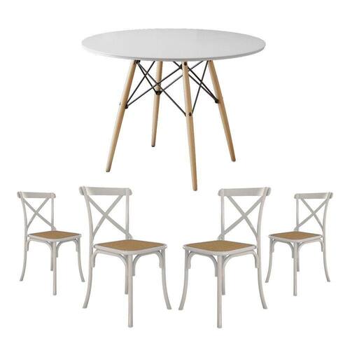 Jogo De Mesa Eiffel Redondo Tampo De Madeira 110cm Branco Com 4 Cadeiras Katrina Branca Assento Bege