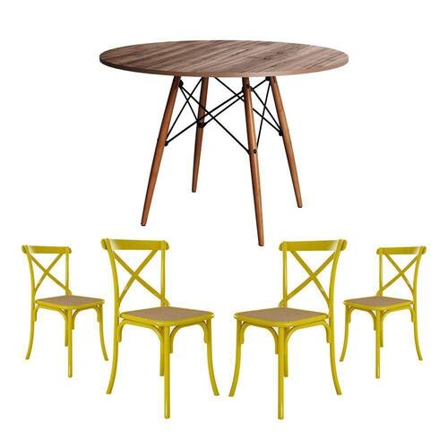 Jogo De Mesa Eiffel Redondo Tampo De Madeira 90cm Amêndoa Com 4 Cadeiras Katrina Amarela Assento Beg
