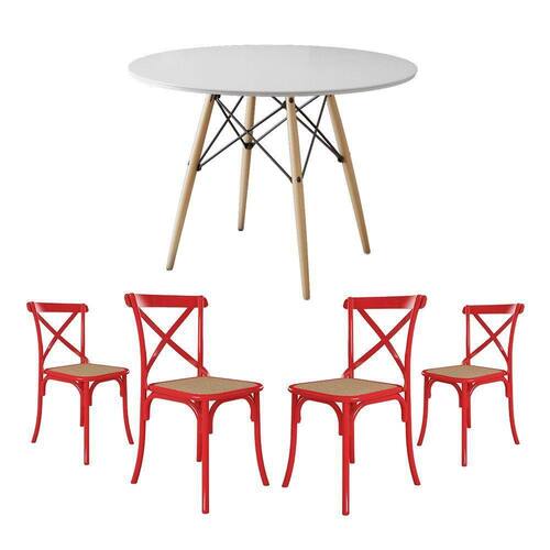 Jogo De Mesa Eiffel Redondo Tampo De Madeira 90cm Branco Com 4 Cadeiras Katrina Vermelha Assento Beg