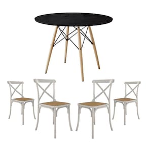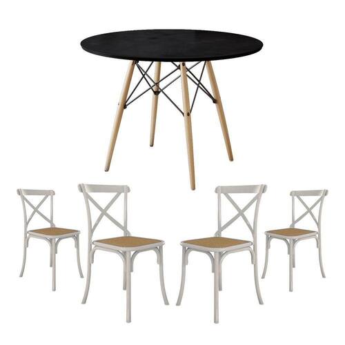 Jogo De Mesa Eiffel Redondo Tampo De Madeira 90Cm Preto Com 4 Cadeiras Katrina Branca Assento Bege