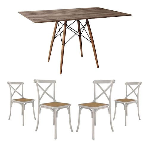 Jogo De Mesa Eiffel Retangular Tampo De Madeira 120x75cm Amêndoa Com 4 Cadeiras Katrina Branca Assento BegeA sua cozinha ou sala de jantar ficará completa com esse lindo Conjunto de Mesa e Cadeiras! Contendo um design de móveis moderno, elegante e com uma ousada combinação de cores, esse é um kit que certamente é uma solução que esbanja estilo, elegância e muito requinte.O conjunto tem em sua diversificada estrutura de materiais com altíssima qualidade, que proporciona muito mais resistência, mesmo com o passar dos anos, e com seus 4 assentos Katrina Aço é ideal para um jantar em família sem abrir mão do conforto. O Kit acompanha versatilidade e combina com vários tipos de decoração, o que dá mais praticidade em sua casa sem abrir mão de um espaço a mais na mesa.Informações técnicas Conjunto:Conteúdo da Embalagem: 01 Mesa e 04 Cadeiras (Embalados Separadamente).Instruções/Cuidados: Limpar com pano seco ou levemente umedecido com água.Necessita de Montagem? Sim.Mesa:Modelo: Eiffel WoodTipo: RetangularCor do tampo: Amêndoa Cor da base dos pés: Wood (Madeira)Material do tampo: Madeira Material dos pés: MadeiraDimensões: Altura: 76 cm // Largura: 120 cm // Profundidade: 75 cmCadeiras:Modelo: KatrinaCor: Branca e BegeMaterial da estrutura: Aço com Pintura E-PoxMaterial do assento: Espuma D14 com Revestimento em Corano.Dimensões: Altura: 90 cm // Largura: 50 cm // Profundidade: 55 cmJogo de Mesa Eiffel Retangular Tampo de Madeira 120x75cm AmÃndoa com 4 Cadeiras Katrina Branca Assen