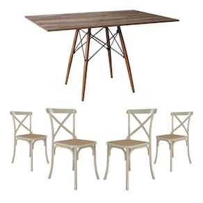 Jogo De Mesa Eiffel Retangular Tampo De Madeira 120x75cm Amêndoa Com 4 Cadeiras Katrina em Aço Off White Assento Bege A sua cozinha ou sala de jantar ficará completa com esse lindo Conjunto de Mesa e Cadeiras! Contendo um design de móveis moderno, elegante e com uma ousada combinação de cores, esse é um kit que certamente é uma solução que esbanja estilo, elegância e muito requinte.O conjunto tem em sua diversificada estrutura de materiais com altíssima qualidade, que proporciona muito mais resistência, mesmo com o passar dos anos, e com seus 4 assentos Katrina Aço é ideal para um jantar em família sem abrir mão do conforto. O Kit acompanha versatilidade e combina com vários tipos de decoração, o que dá mais praticidade em sua casa sem abrir mão de um espaço a mais na mesa.Informações técnicas Conjunto:Conteúdo da Embalagem: 01 Mesa e 04 Cadeiras (Embalados Separadamente).Instruções/Cuidados: Limpar com pano seco ou levemente umedecido com água.Necessita de Montagem? Sim.Mesa:Modelo: Eiffel WoodTipo: RetangularCor do tampo: Amêndoa Cor da base dos pés: Wood (Madeira)Material do tampo: Madeira Material dos pés: MadeiraDimensões: Altura: 76 cm // Largura: 120 cm // Profundidade: 75 cmCadeiras:Modelo: KatrinaCor: Off White e BegeMaterial da estrutura: Aço com Pintura E-PoxMaterial do assento: Espuma D14 com Revestimento em Corano.Dimensões: Altura: 90 cm // Largura: 50 cm // Profundidade: 55 cmJogo de Mesa Eiffel Retangular Tampo de Madeira 120x75cm AmÃndoa com 4 Cadeiras Katrina Off White As
