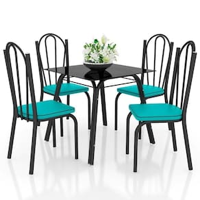 O Jogo de Mesa Lótus Tampo de Vidro e 4 Cadeiras 121 Preto/Azul Turquesa - Artefamol, tem design sofisticado, composto por uma mesa quadrada com tampo de vidro temperado de 5 mm e acompanha 4 cadeiras com assentos revestidos em courvin sendo fácil de limpar. Estrutura em aço carbono e acabamento em pintura epóxi, com tratamento de fosfatização, garantindo maior resistência a oxidação e fixação da pintura. Deixe sua cozinha mais bela com esse jogo de mesa e cadeiras da Artefamol!