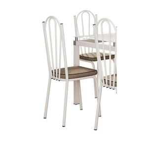 Estrutura de Aço Carbono, com tampo de Vidro Branco temperado de 5 mm, cadeiras com estrutura de Aço Carbono com assento de MDP revestido de Courvin e espuma 30 mm.