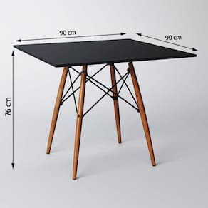 JOGO DE MESA EAMES TAMPO QUADRADO PRETO 90CM 4 CADEIRAS PRETAS Base: Madeira com fios de aço carbono pintados entrelaçados.- Tampo: Madeira- Tampo de Madeira (mdp) com espessura de 18 mm.Esse produto contém 90cm tampo preto quadradoCozinha E Jantar Montagem: Necessita Montagem? Parcialmente( Produto Entregue Montado Parcialmente)Jogo de Mesa Eames Tampo Quadrado Preto 90cm 4 Cadeiras Pretas