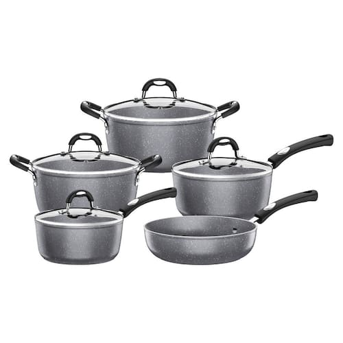 O conjunto conta com revestimento interno e externo antiaderente Starflon Premium, que evita que os alimentos grudem, facilita a limpeza e oferece maior resistência ao uso frequente. Seu acabamento na cor preta com efeito granitado traz um visual moderno e elegante, valorizando a cozinha.