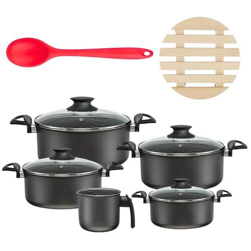 01 Caçarola 16cm 01 Caçarola 18cm 01 Caçarola 20cm 01 Caçarola 22cm 01 Fervedor 14cm 05 Descansos de Panela 01 Colher de Silicone Marca: Não Informado