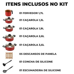 01 Caçarola 16cm 01 Caçarola 18cm 01 Caçarola 20cm 01 Caçarola 22cm 01 Fervedor 14cm 05 Descansos de Panela 01 Concha de Silicone 01 Escumadeira de Silicone Marca: Não Informado Ean: 7894141427306