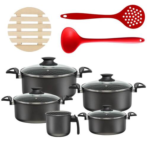01 Caçarola 16cm 01 Caçarola 18cm 01 Caçarola 20cm 01 Caçarola 22cm 01 Fervedor 14cm 05 Descansos de Panela 01 Concha de Silicone 01 Escumadeira de Silicone Marca: Não Informado Ean: 7894141427382