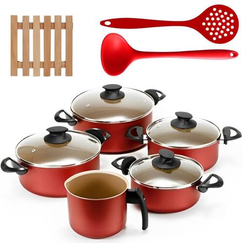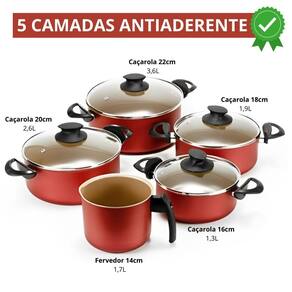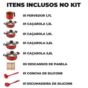 01 Caçarola 16cm 01 Caçarola 18cm 01 Caçarola 20cm 01 Caçarola 22cm 01 Fervedor 14cm 05 Descansos de Panela 01 Concha de Silicone 01 Escumadeira de Silicone Marca: Não Informado