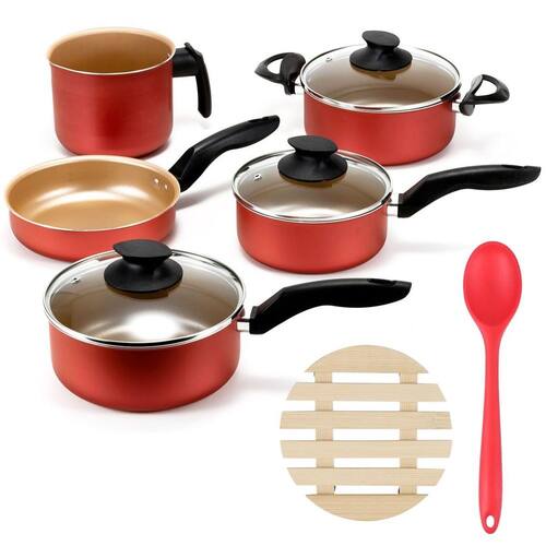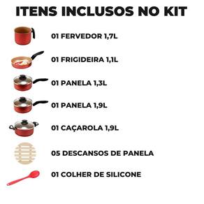 01 Panela 16cm com tampa de vidro 01 Panela 18cm com tampa de vidro 01 Caçarola 18cm com tampa de vidro 01 Frigideira 18cm sem tampa 01 Fervedor 12cm 05 Descansos de Panela 01 Colher de Silicone Marca: Não Informado