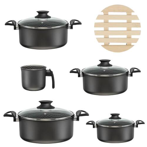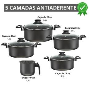 - Revestimento Antiaderente de Alta Qualidade: Facilita o cozimento e a limpeza, evitando que os alimentos grudem. - Tampa de Vidro: Permite acompanhar o preparo dos alimentos sem abrir a panela, mantendo o calor e a umidade. - Versatilidade e Design Moderno: Conjunto completo com peças essenciais para diversas receitas, com design elegante para qualquer cozinha.