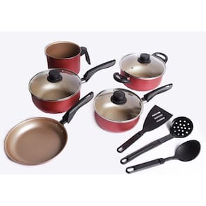 Jogo de panelas 08 peças cereja antiaderente remazaMais nova exclusividade das panelas remaza um verdadeiro aliado tanto no preparo das refeições do dia a dia quanto nas servidas em ocasiões especiais. O conjunto formado por 05 peças e 03 utensílios diminui seu tempo à frente do fogão, além de deixar os alimentos com um cozimento uniforme. Por ser serem desenvolvidas com cabos e alças de baquelite térmico, você pode pegar as panelas com toda a segurança e a garantia de não esquentar, além de poder levar qualquer um dos itens tanto à geladeira como à máquina lava-louças. As tampas feitas com vidro temperado permitem o acompanhar o cozimento das receitas sem precisar abri-las durante o processo.Além da praticidade do cozimento uniforme, proporcionado pelo revestimento interno e externo, elas permanecem bonitas por muito mais tempo. São fáceis de limpar, pois, devido ao antiaderente, os alimentos não grudam.Composição:01x caçarola nº 18 antiaderente com tampa de vidro com saída vapor e borda em inox.01x panela nº 18 antiaderente com tampa de vidro com saída vapor e borda em inox.01x caçarola nº 16 antiaderente com tampa de vidro com saída vapor e borda em inox01x frigideira francesa nº 18 antiaderente01x fervedor nº 1401x espatula em nylon01x colher em nylon01x escumadeira em nylonImagens meramente ilustrativas. Itens decorativos não acompanham o produtoVerifique o carrinho antes de finalizar a compra, pois não podemos fazer alterações de endereço ou produto uma vez que a compra é aprovadaImagens meramente ilustrativas. As tonalidades podem variar de acordo com seu monitor ou até mesmo com a percepção dos seus olhosO fabricante pode alterar detalhes nos produtos sem aviso prévio