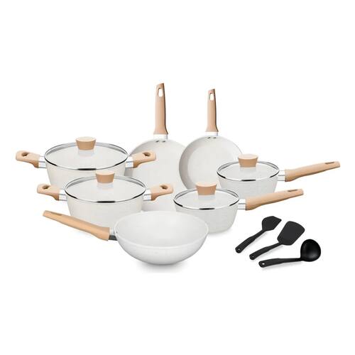 O Jogo de Panelas Carmela com 10 peças da MTA é a escolha ideal para quem busca elegância, eficiência e versatilidade na cozinha. Além do design retrô e acabamento sofisticado, esta versão é compatível com todos os tipos de fogões, inclusive indução, graças ao seu fundo de aço inox magnético que garante melhor condução de calor. Produzidas em alumínio de alta qualidade com revestimento antiaderente ultra resistente, as panelas oferecem cozimento uniforme e refeições mais saudáveis, pois exigem pouco uso de óleo. O revestimento facilita a limpeza e evita que os alimentos grudem. O charme fica por conta da pintura esmaltada colorida e das tampas em vidro temperado com saída de vapor, que permitem acompanhar o preparo dos pratos sem abrir as panelas. Os cabos e alças em baquelite antitérmico são seguros e confortáveis de manusear. O que acompanha o jogo: 1 Caçarola com tampa nº 22 3 litros 1 Caçarola com tampa nº 20 2,4 litros 1 Panela nº 18 1,8 litros 1 Panela nº 16 1,2 litros 1 Frigideira nº 22 1,3 litros 1 Frigideira nº 20 1 litro 1 Wok nº 24 2,3 litros 1 Espátula 1 Concha 1 Espátula Grande Destaques do produto: Compatível com todos os fogões, incluindo indução Fundo difusor que distribui melhor o calor e evita deformações Revestimento antiaderente de alta performance (livre de PFOA) Acabamento externo esmaltado com cores vivas e modernas Ideal para uso diário com estilo e praticidade Especificações: Marca: MTA Linha: Carmela Vanilla Material: Alumínio com fundo de indução e antiaderente interno Uso indicado: Gás, elétrico, vitrocerâmico e indução Fácil de limpar e resistente ao uso contínuo