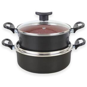 - Design sofisticado e moderno: com acabamento externo preto e revestimento interno vermelho com efeito marmorizado, esse conjunto de panelas oferece elegância e funcionalidade. Ele vai transformar o visual da sua cozinha, trazendo estilo e praticidade para o seu dia a dia.