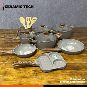 Distribuído por feheros shop Jogo de panelas 11 peças premium indução revestimento cerâmico Atenção As panelas com revestimento cerâmico oferecem propriedades antiaderentes, mas não são 100% antiaderentes. Para melhores resultados, recomenda-se o uso de pequenas quantidades de óleo ou . O revestimento cerâmico é uma alternativa saudável e ecológica, pois não libera substâncias tóxicas quando aquecido. - panelas premium com certificação inmetro nível a - não deixe a chama do fogão pegar nas laterais das panelas - leia atentamente a descrição e siga as recomendações do fabricante Informações do produto - versatilidade incrível: compatível com fogões a gás, elétrico, vitrocerâmico e de indução - durabilidade excepcional: revestimento cerâmico resistente a arranhões e abrasões - cozinha saudável: livre de pfoa e ptfe, ideal para quem busca mais saúde - design premium: acabamento moderno e elegante que facilita a limpeza - economia de tempo e energia: aquece rápido e distribui o calor de forma uniforme - conjunto completo: 11 peças para preparar diversas receitas com praticidade Especificações técnicas - compatível com fogões a gás, elétricos, vitrocerâmicos e de indução - revestimento cerâmico em 3 camadas com espessura de 4 mm - cabo de baquelite com revestimento soft touch, confortável e seguro - permite cozinhar com menos óleo graças ao revestimento antiaderente cerâmico - livre de pfoa e classificado como nível a no inmetro - fundo triplo com indução: estrutura em alumínio com cerâmica, economia de energia - composição de revestimento: 2 camadas cerâmicas + 1 camada resistente a alta temperatura Ficha técnica do produto - panela 16 cm: d 16 cm x a 8,5 cm c 1300 ml p 730 g - panela 20 cm: d 20 cm x a 9 cm c 2250 ml p 1050 g - caçarola 20 cm: d 20 cm x a 9 cm c 2250 ml p 1080 g - caçarola 22 cm: d 22 cm x a 10 cm c 3250 ml p 1350 g - leiteira 14 cm: d 14 cm x a 10,5 cm c 2000 ml p 350 g - frigideira 18 cm: d 18 cm x a 4 cm c 750 ml p 300 g - frigideira 22 cm: d 22 cm x a 4,7 cm c 1450 ml p 500 g - frigideira grill 3 em 1: 18 x 18 cm x a 2 cm p 600 g - espátula vazada de bambu: 30 x 6 x 1 cm - colher vazada de bambu: 30 x 6 x 1 cm - colher para arroz de bambu: 30 x 6 x 1 cm Importante: d= diâmetro, a= altura, c= capacidade, p= peso Antes do primeiro uso - lave com esponja macia e detergente - seque com pano de prato - aplique um pouco de óleo na parte interna - leve ao fogo baixo por 2 minutos - desligue o fogo e espere esfriar - lave novamente e seque Após o uso - evite choques térmicos. Deixe esfriar antes de lavar - lave à mão com água morna, esponja macia e detergente - enxágue e seque com pano macio - para alimentos queimados, deixe de molho e use materiais não abrasivos - não utilize utensílios metálicos, objetos afiados ou produtos abrasivos Itens inclusos no pacote - 01 panela 16 cm 1,3 l com tampa de vidro - 01 panela 20 cm 2,25 l com tampa de vidro - 01 caçarola 20 cm 2,25 l com tampa de vidro - 01 caçarola 22 cm 3,25 l com tampa de vidro - 01 leiteira 14 cm 2 l - 01 frigideira 18 cm 0,75 l - 01 frigideira 22 cm 1,45 l - 01 frigideira grill 3 em 1 - 01 espátula vazada de bambu - 01 colher vazada de bambu - 01 colher para arroz de bambu Todas as fotos são reais dos produtos. Qualquer dúvida, estamos à disposição 01- o produto pode ir ao forno R: não, estes modelos não são adequados para uso no forno devido ao cabo em baquelite. 02- o produto é novo Possui R: sim, o produto é novo e possui de 3 meses conforme as normas do fabricante. 03- é compatível com fogão de indução R: sim, possuem fundo especial que permite o uso em fogões de indução, além de fogões a gás, elétricos e vitrocerâmicos.