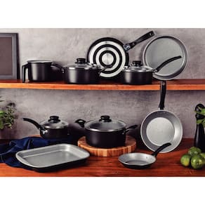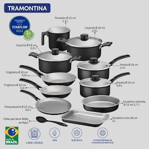 Seja qual for a receita que você vai preparar, é essencial contar com itens de qualidade, como o jogo de panelas Tramontina Turim em alumínio com revestimento interno e externo em antiaderente Starflon Max preto 11 peças. Aptas para uso no dia a dia, suas peças garantem maior segurança e facilidade na hora preparar suas refeições, pois contam com cabos, alças e pegadores em baquelite e nylon e vem com tampas de vidro temperado com borda de aço inox. Você ainda cozinha de maneira rápida e uniforme, sem que os alimentos grudem em sua superfície e tem facilidade na limpeza, pois o corpo das peças tem produção em alumínio com revestimento em antiaderente Starflon Max. Escolha Tramontina e deixe suas tarefas na cozinha, ainda melhores!