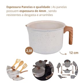 2 Panelas: 16 cm 1,3 Litros com Tampa de Vidro 1 Panela: 20 cm 2,25 Litros com Tampa de Vidro 1 Caçarola: 20 cm 2,25 Litros com Tampa de Vidro 1 Caçarola: 22 cm 3,25 Litros com Tampa de Vidro 1 Leiteira: 14 cm 2 Litros 1 Frigideira: 18 cm 0,75 Litros 1 Frigideira: 22 cm 1,45 Litros 1 Espátula Vazada em Bambu 1 Colher Vazada em Bambu 1 Colher para Arroz em Bambu