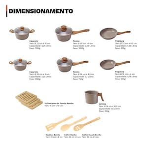 Distribuído por feheros shop Jogo de panelas 13 peças premium indução revestimento cerâmico antiaderente 4mm Atenção As panelas com revestimento cerâmico possuem propriedades antiaderentes, o que significa que ajudam a evitar que os alimentos grudem durante o cozimento. No entanto, elas não são 100% antiaderentes. - panelas premium com certificação inmetro nível a - não deixem a chama do fogão pegar nas laterais das panelas, isso pode causar danos na panela - leia atentamente a descrição e siga o passo a passo que o fabricante recomenda Informações do produto: - durabilidade excepcional: o revestimento cerâmico de alta qualidade garante resistência a arranhões e abrasões, prolongando a vida útil das suas panelas. - cozinha saudável: a cerâmica é livre de pfoa e ptfe, tornando suas refeições mais saudáveis e saborosas. - design premium: o acabamento moderno e elegante não apenas torna sua cozinha mais bonita, mas também é funcional, tornando a limpeza uma tarefa simples. - economia de tempo e energia: o revestimento cerâmico aquece mais rápido e mantém o calor de maneira uniforme, economizando energia e reduzindo o tempo de cozimento. Especificações técnicas: - pode ser em todos os tipos de fogões existentes no mercado, a gás, elétricos, vitrocerâmicos e de indução - seu cabo em baquelite possui revestimento soft touch, que é super macio ao toque, confortável de segurar e evita queimaduras - o revestimento cerâmico não gruda nos alimentos, permitindo que use menos óleo - é livre de pfoa, por isso possui classificação a excelente no inmetro - fundo triplo indução, economiza energia e cozinha mais rápido, estrutura de alumínio revestida em cerâmica - possui 3 camadas, sendo 2 camadas de revestimento cerâmico e 1 camada resistente a alta temperatura Ficha técnica do produto: - panela 16 p : 16 cm x 8,5 cm - 1300 ml - peso: 730g - panela 20 m : 20 cm x 9 cm - 2250 ml - peso: 1050g - caçarola 20 m : 20 cm x 9 cm - 2250 ml - peso: 1080g - caçarola 22 g : 22 cm x 10 cm - 3250 ml - peso: 1350g - leiteira 14: 14 cm x 10,5 cm - 2000 ml - peso: 350g - frigideira 18: 18 cm x 4 cm - 750 ml - peso: 300g - frigideira 22: 22 cm x 4,7 cm - 1450 ml - peso: 500g - espátula vazada de bambu: 30 x 6 x 1 cm - colher vazada de bambu: 30 x 6 x 1 cm - colher de arroz de bambu: 30 x 6 x 1 cm - 3 descansos de panela de bambu: 15 x 15 cm Antes do primeiro uso cura do produto : - lave a panela com uma esponja macia e detergente líquido. - seque bem com um pano de prato. - coloque um pouco de óleo na parte interna. - leve ao fogo baixo e aguarde 2 minutos. - desligue o fogo e espere a panela esfriar. - lave novamente e seque Após o uso: - deixe esfriar antes de lavar - use esponja macia e detergente neutro - enxágue e seque com pano macio - para remover resíduos mais difíceis, deixe de molho em água morna - evite utensílios metálicos e produtos abrasivos Itens inclusos no pacote: 01 panela 16 cm revestimento cerâmico 1,3l com tampa de vidro 01 panela 20 cm revestimento cerâmico 2,25l com tampa de vidro 01 caçarola 20 cm revestimento cerâmico 2,25l com tampa de vidro 01 caçarola 22 cm revestimento cerâmico 3,25l com tampa de vidro 01 leiteira 14 cm revestimento cerâmico 2l 01 frigideira 18 cm revestimento cerâmico 0,75l 01 frigideira 22 cm revestimento cerâmico 1,45l 01 espátula vazada em bambu 01 colher vazada em bambu 01 colher de arroz em bambu 03 descansos de panela de bambu 15 x 15 cm Todas as fotos são reais dos produtos. Qualquer dúvida, estamos à disposição Dúvidas frequentes 01 - o produto é novo Possui 02 - é compatível com fogão de indução R: sim. Todas as peças com fundo triplo são compatíveis com indução, gás, vitrocerâmico e elétrico