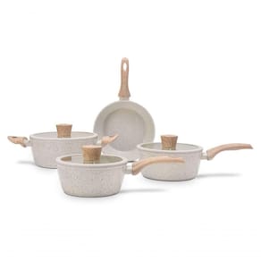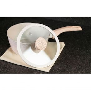 Característica-3 - MATERIAIS: o conjunto de panelas 4 peças da Linha Ceramic Life Sirius/ Brinox é fabricado na cor Vanilla com estrutura em alumínio que cozinha por igual e mais rápido. A tampa flat é de vidro temperado, borda de silicone e saída para o vapor, o que torna a experiência de cozinhar ainda mais fascinante. Os cabos e alças são fabricados em soft-touch de efeito amadeirado. Livre de PFOA, o revestimento interno é com antiaderente Mineral Resist.