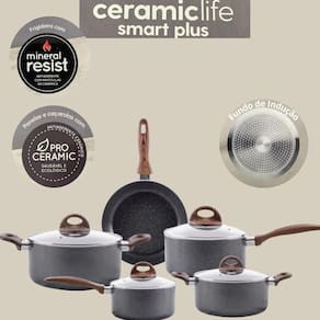 Benefícios Adicionais:Fácil de Limpar: O revestimento antiaderente facilita a limpeza, economizando tempo.Resistência e Durabilidade: Material de alta qualidade que garante maior vida útil ao produto.Sustentabilidade: Produto livre de PFOA, fabricado por uma empresa que utiliza energia renovável e práticas ecologicamente responsáveis.Leve mais qualidade, design e saúde para sua cozinha com o Jogo de Panelas Ceramic Life Smart Plus Granito. Seja para preparar refeições rápidas ou pratos mais elaborados, este conjunto oferece versatilidade e eficiência com um toque de sofisticação. Garanta já o seu e cozinhe com estilo e praticidade