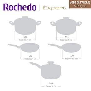 Jogo de Panelas 5 Peças Chocolate Rochedo Expert O Jogo de Panelas Rochedo Expert Chocolate 5 peças combina modernidade e qualidade para transformar sua cozinha. Composto por caçarolas de 20 cm e 24 cm, panela de 16 cm e frigideiras de 20 cm e 24 cm, conta com antiaderente Resist 5X reforçado com partículas minerais, garantindo alta performance e durabilidade. Feitas em alumínio com alta espessura, proporcionam cozimento homogêneo e melhor distribuição de calor. Possuem base limpa fácil, marcas de medidas e o exclusivo Thermo-sinal, que muda de cor indicando o momento ideal para selar os alimentos. Com design moderno na cor chocolate, são livres de PFOA, compatíveis com fogões a gás, vitrocerâmicos e elétricos, além de serem fáceis de limpar na lava-louças. Atributos do Produto: Referência: 000000005861034768 Código: 5861034768 Código de Barras: 7702073582157 Cor: Marrom Chocolate : 3 Meses Fabricante Marca: Rochedo Modelo: Expert 5 peças Tipo de Material: Alumínio Registro no INMETRO: Panelas e caçarolas 007605/2024 - Frigideiras 007617/2024 Detalhes e Especificações Técnicas: Base limpa fácil Marcas de medidas Antiaderente Resist 5X Alumínio com alta espessura Design moderno na cor chocolate Thermo-sinal muda de cor indicando o momento ideal de selar seu alimento Dimensões da Embalagem: Altura: 22,0 cm Largura: 30,0 cm Comprimento: 48,0 cm Peso: 4,556 Kg Conteúdo da Embalagem: 01 Caçarola 2,7 Litros 20cm / 32 x 15cm CxA 01 Caçarola 4,6 Litros 24cm / 37 x 16,5cm CxA 01 Panela 1,5 Litros 16cm / 31,5 x 9cm CxA 01 Frigideira 0,9 Litros 20cm / 35,5 x 4cm CxA 01 Frigideira 1,7 Litros 24cm / 41 x 5cm CxA 01 Manual de instruções Importante Produtos de decoração não inclusos. Imagens meramente ilustrativas; As cores dos objetos podem sofrer alterações devido a luminosidade, configurações do monitor e até mesmo a percepção do usuário; Os dados divulgados são de responsabilidade do fabricante/fornecedor.