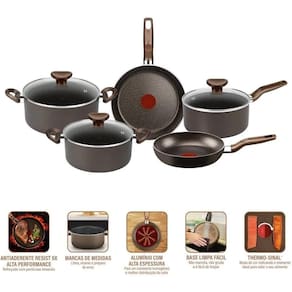 Jogo de Panelas 5 Peças Chocolate Rochedo Expert O Jogo de Panelas Rochedo Expert Chocolate 5 peças combina modernidade e qualidade para transformar sua cozinha. Composto por caçarolas de 20 cm e 24 cm, panela de 16 cm e frigideiras de 20 cm e 24 cm, conta com antiaderente Resist 5X reforçado com partículas minerais, garantindo alta performance e durabilidade. Feitas em alumínio com alta espessura, proporcionam cozimento homogêneo e melhor distribuição de calor. Possuem base limpa fácil, marcas de medidas e o exclusivo Thermo-sinal, que muda de cor indicando o momento ideal para selar os alimentos. Com design moderno na cor chocolate, são livres de PFOA, compatíveis com fogões a gás, vitrocerâmicos e elétricos, além de serem fáceis de limpar na lava-louças. Atributos do Produto: Referência: 000000005861034768 Código: 5861034768 Código de Barras: 7702073582157 Cor: Marrom Chocolate : 3 Meses Fabricante Marca: Rochedo Modelo: Expert 5 peças Tipo de Material: Alumínio Registro no INMETRO: Panelas e caçarolas 007605/2024 - Frigideiras 007617/2024 Detalhes e Especificações Técnicas: Base limpa fácil Marcas de medidas Antiaderente Resist 5X Alumínio com alta espessura Design moderno na cor chocolate Thermo-sinal muda de cor indicando o momento ideal de selar seu alimento Dimensões da Embalagem: Altura: 22,0 cm Largura: 30,0 cm Comprimento: 48,0 cm Peso: 4,556 Kg Conteúdo da Embalagem: 01 Caçarola 2,7 Litros 20cm / 32 x 15cm CxA 01 Caçarola 4,6 Litros 24cm / 37 x 16,5cm CxA 01 Panela 1,5 Litros 16cm / 31,5 x 9cm CxA 01 Frigideira 0,9 Litros 20cm / 35,5 x 4cm CxA 01 Frigideira 1,7 Litros 24cm / 41 x 5cm CxA 01 Manual de instruções Importante Produtos de decoração não inclusos. Imagens meramente ilustrativas; As cores dos objetos podem sofrer alterações devido a luminosidade, configurações do monitor e até mesmo a percepção do usuário; Os dados divulgados são de responsabilidade do fabricante/fornecedor.