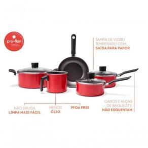 Com estrutura de alumínio que dissipa melhor o calor, cozinhando o alimento por igual, o conjunto de panelas é composto por 5 peças: uma caçarola com tampa 22x10 e 3,4 litros , duas panelas com tampa de 18x8 e 1,75 litro e 16x7 cm e 1,2 litro, uma frigideira de 20x4cm e 0,8 litro e um fervedor de 12x11,5cm e 1,2 litro. O revestimento interno é antiaderente, não deixando o alimento grudar, mesmo com uso reduzido de óleo o que torna a limpeza mais fácil. Os cabos de baquelite não aquecem, tornando o manuseio dos utensílios mais fácil e seguro. As caçarolas e panelas, disponíveis na cor vermelho, ainda possuem tampa de vidro temperado com saída para o vapor. O ciclo de vida do produto pode variar conforme frequência e intensidade da utilização. O produto deve ser descartado (livre de materiais orgânicos) em coletores de resíduos seletivos. A logística reversa não é aplicável.Certificação compulsória certificada pelo OCP 0070, registros 000888/2021, 000887/2021 e 000726/2021 e classificação de antiaderência A (ótima), conforme Portaria Inmetro 499/2021.