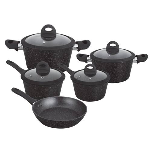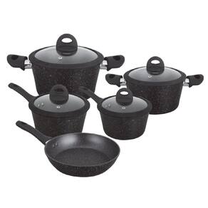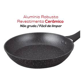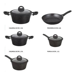 É composto por duas caçarolas, duas panelas com cabo e uma frigideira, todos em alumínio com revestimento cerâmico na cor preta esmaltada e granilites brancos.