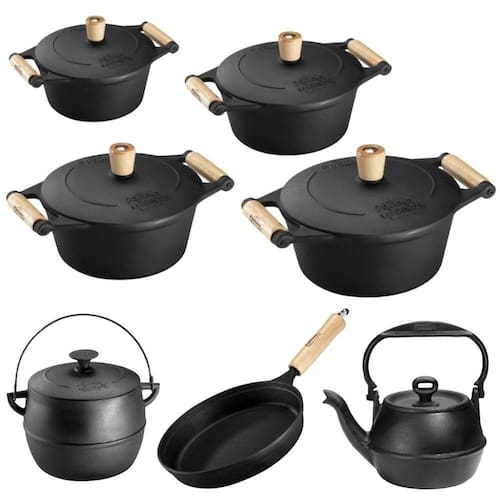 Jogo de Panelas 7 Peças em Ferro Fundido e Alça de Madeira Panela Mineira - Itens Inclusos