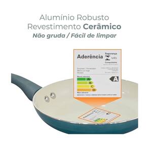 - Alumínio com revestimento cerâmico - Tampas de vidro temperado com bordas em silicone - Cabos e alças siliconadas - Cor: Parte externa azul metalizado e parte interna creme - Espessura 2,5mm