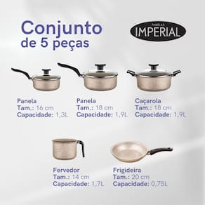 01- Panela de 16cm de diâmetro 01- Panela de 18cm 01- Caçarola de 18cm 01- Fervedor de 14cm 01- frigideira de 20cm