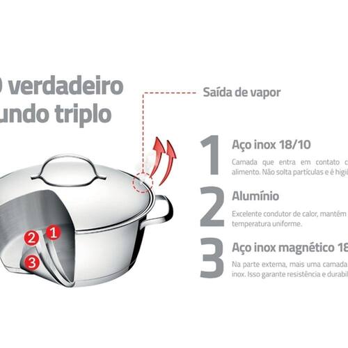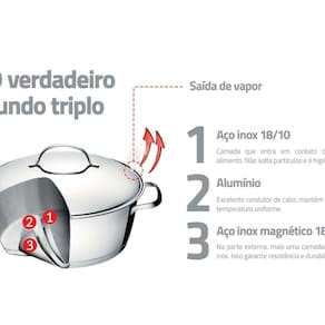 O fundo triplo (aço inox + alumínio + aço inox) distribui o calor uniformemente, proporcionando um cozimento mais rápido e uniforme, economizando energia e deixando os alimentos aquecidos por mais tempo.