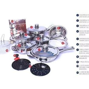 Relação das peças: 1 Caçarola 6,5 litros medindo 24cmX14cm com tampa de vidro temperado 1 Caçarola 3,0 litros medindo 20cmX10cm com tampa de vidro temperado 1 Caçarola 1,6 litros medindo 16cmX8cm com tampa de vidro temperado 1 Frigideira 3,05 litros medindo 24cmX6,5cm com tampa de vidro temperado 1 Panela 1,6 litros medindo 16cmX9cm com tampa de vidro temperado 1 Panela vaporizadora medindo 20cmX10cm sem tampa 1 Fritadeira medindo 18cm 1 Bacia para misturas medindo 20cmX6cm com tampa plástica 2 Suporte de panelas em bakelite 1 Conjunto de utensílios de cozinha com 6 peças em nylon 1 Botão de sucção Acompanha ainda um livro de receitas escrito em 3 línguas (Alemão, Inglês e Russo), além de um Cartão de Certificação da fábrica. Peso aproximado do conjunto é de 11,5Kgs.